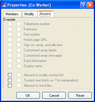 5. To override the group access rights to ALLOWED to modify contact list, IS a TRUSTED user, and ALLOWED to send files, you should set the override check box as follows