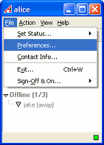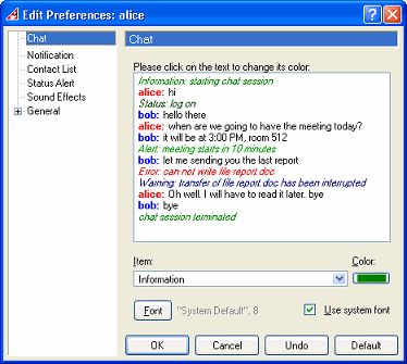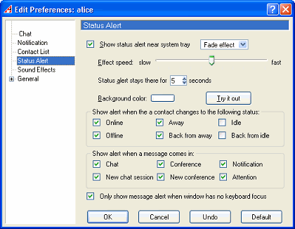 Alerts of user status, chat and conference requests, etc. will appear on your system. You can change the options so that the alert will only appear for specific options.